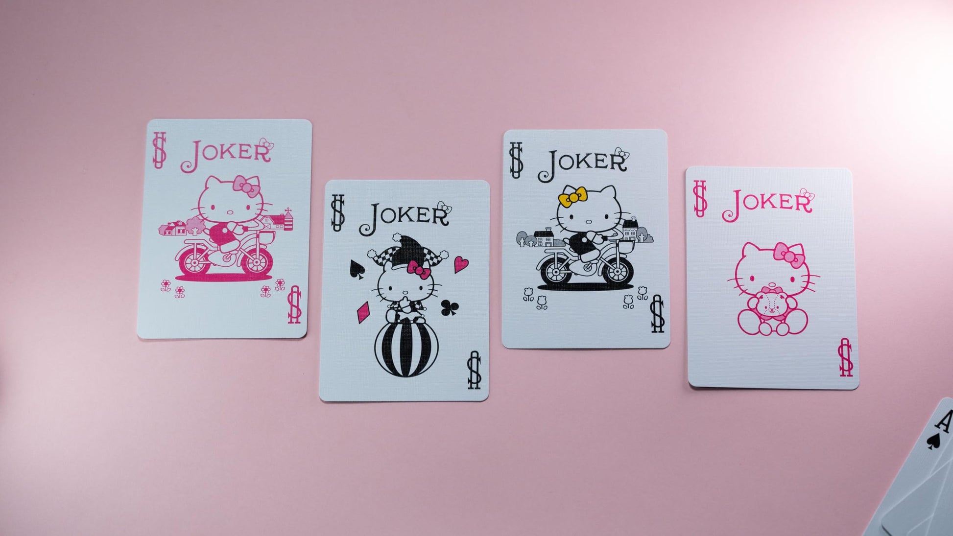 - CUTENESS OVERLOAD – Hello Kitty plays dress‐up on the traditional style court cards featuring Hello Kitty faces in a kawaii black and pink design!